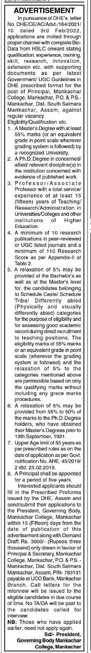 | 24 | Application for the Post of Principal in Mankachar College, Mankachar. | 2022-02-19 | Download |